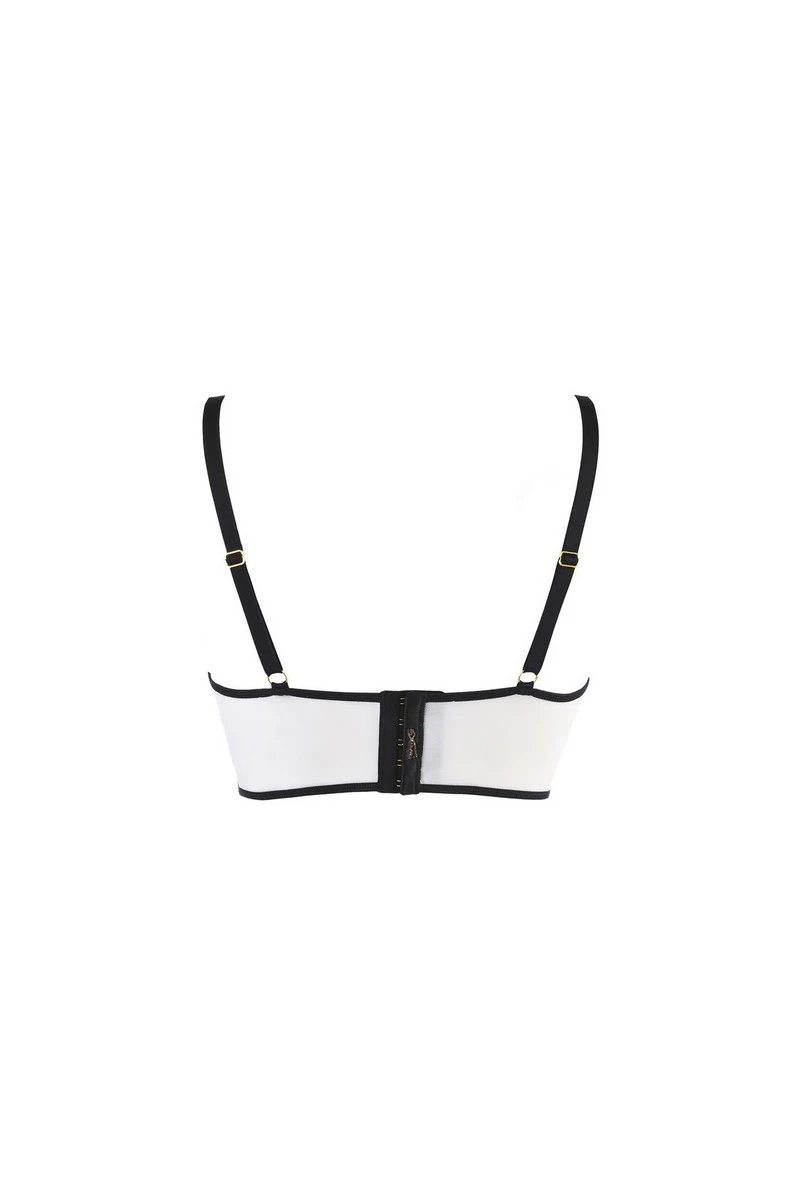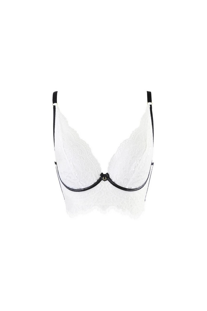 Douceur et féminité seront les atouts dominants pour le soutien-gorge bustier V-10481. Une superbe dentelle blanche, délicate et finement transparente, viendront se poser comme un charme sur votre corps. On aime l’idée de souligner la poitrine d’armatures noires afin d’en augmenter le volume perçu.