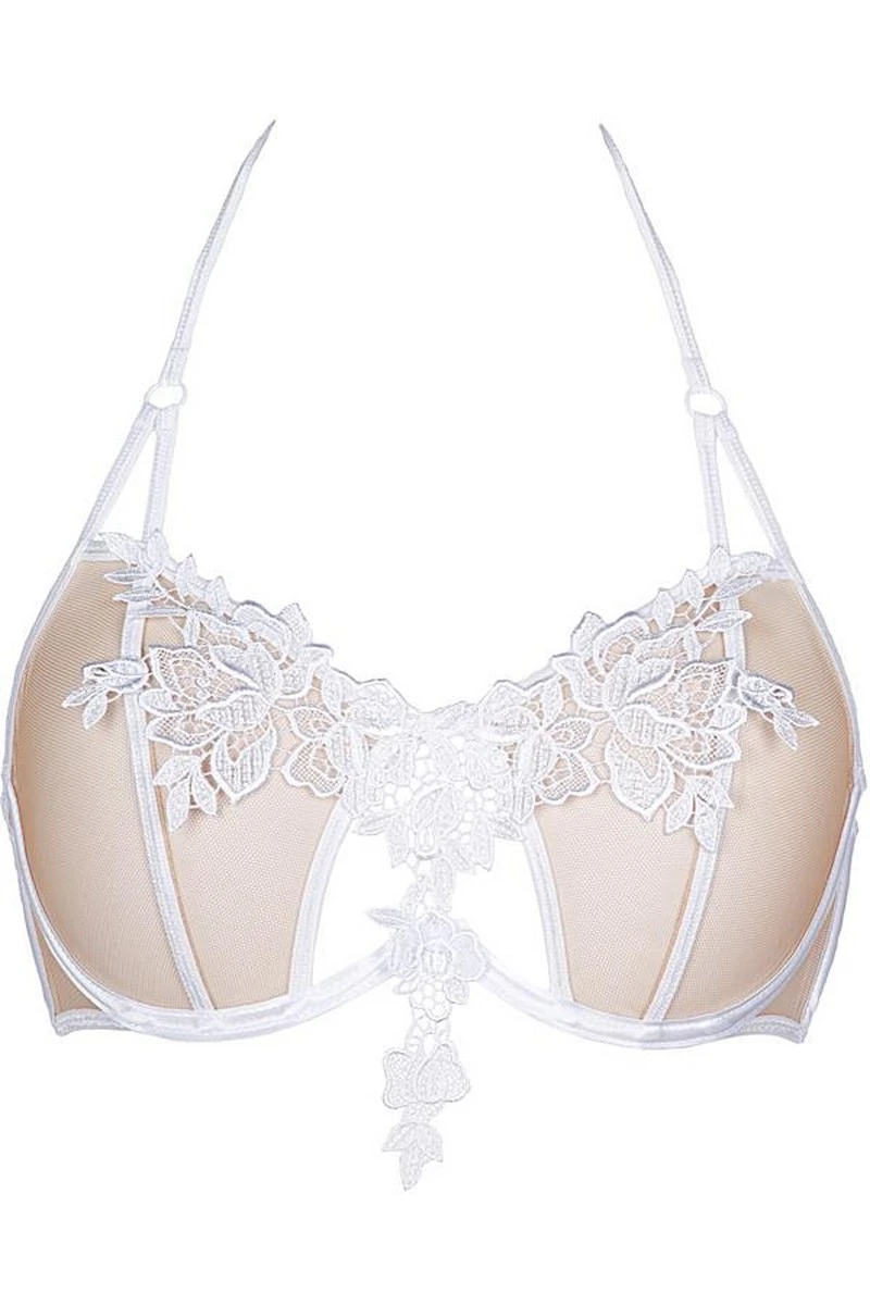 Les bretelles fines pourront se nouer à l’arrière de la nuque pour trouver la hauteur parfaite sur vous. Fermeture au dos par des agrafes. Créez votre panoplie en ajoutant le porte-jarretelles et le string entièrement assortis.
