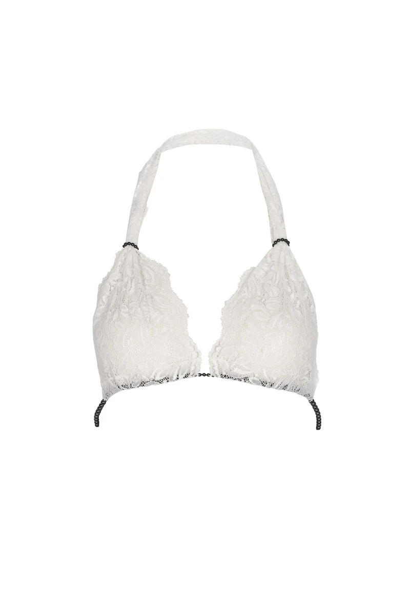Tout de blanc, le soutien-gorge Paris dark atteint un niveau de sensualité chic très élevé. Une dentelle florale douce et finement transparente fera les bonnets, tandis que ces délicates bagues de perles noires permettront un réglage astucieux des bretelles.