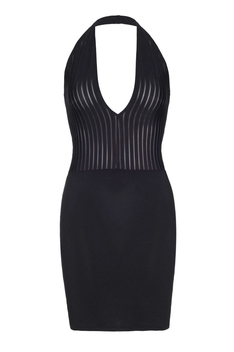 La Robe Corinne est élégante et sensuellement décolletée. D’ailleurs, sa généreuse ouverture en V est assez plongeante pour s’attirer une foule de regards. Les bretelles sont maintenues derrière la nuque afin de laisser le haut du dos nu et les épaules dévoilées. Sa matière extensible assure un look sexy et une silhouette moulée à la perfection. Le haut est rayé et le bas complètement uni et opaque.