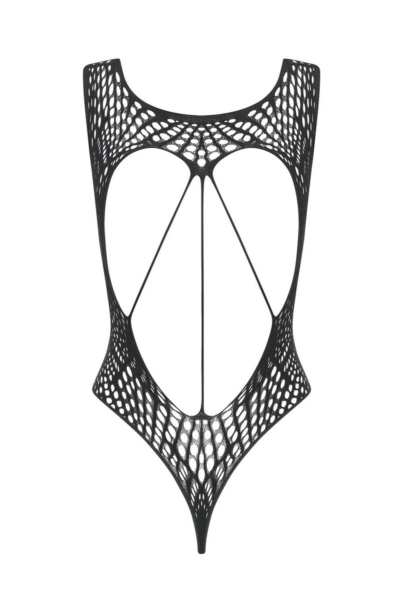 Tout en légèreté, le body noir B127 applique sa magie de résille sur la peau. Elle est un peu transparente par ses micro-ouvertures dispersées ici et là et se trouve être totalement extensible pour mouler les courbes de votre corps. La coupe dévoile les hanches par une échancrure accentuée et qui finit en string pour découvrir les fesses. Le dos-nu ajoute une touche de charme.