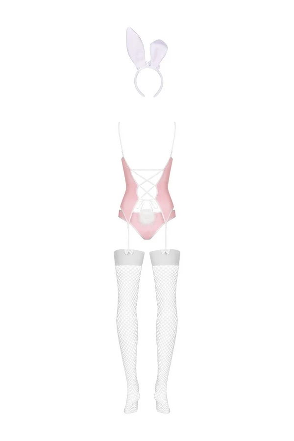 La tenue est composée d’une paire d’oreilles, de la guêpière, d’une culotte pantie surmontée de la petite queue de lapin et des bas en résille. La parfaite panoplie pour des super instants.