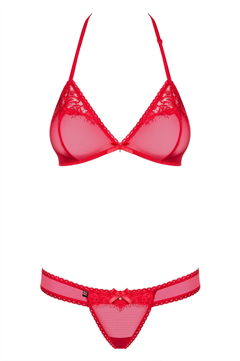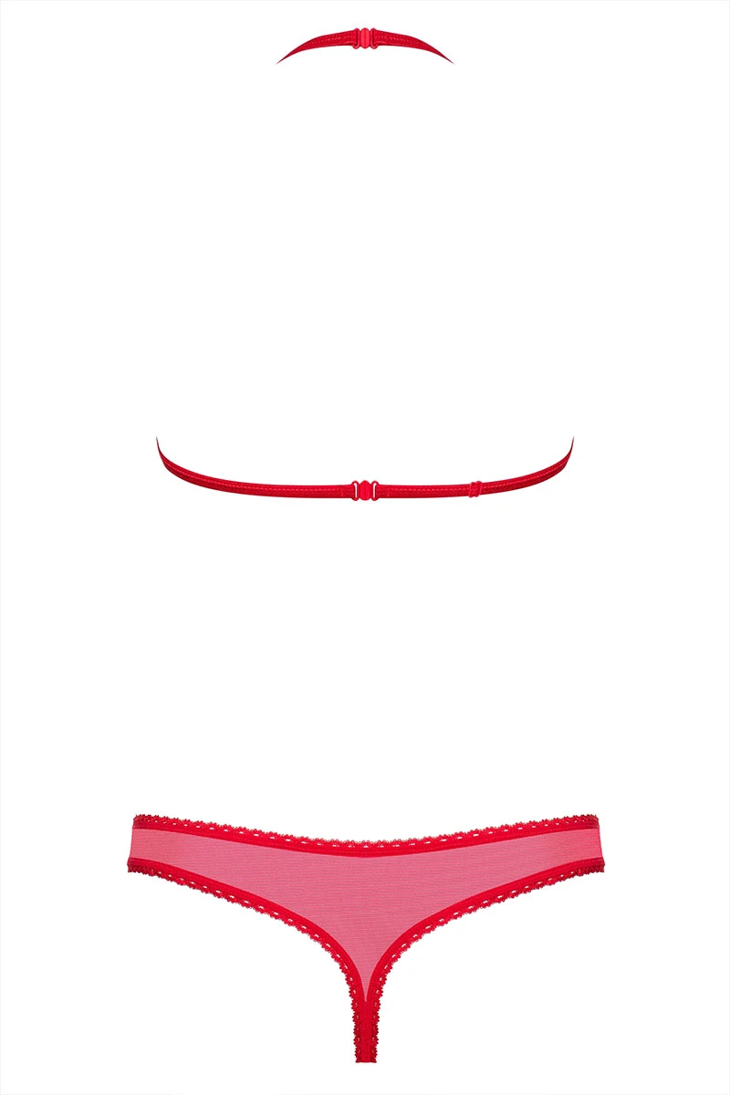 Le parfait deux-pièces symbole de l’amour et de la séduction ; l’ensemble 870-SET est confectionné dans une résille rouge très fine qui nous laissera profiter d’une audacieuse transparence. Le soutien-gorge est totalement souple afin de rendre le galbe de la poitrine plus naturel tout en offrant un certain maintien. Il dégage un décolleté attrayant surmonté d’un petit noeud satiné.