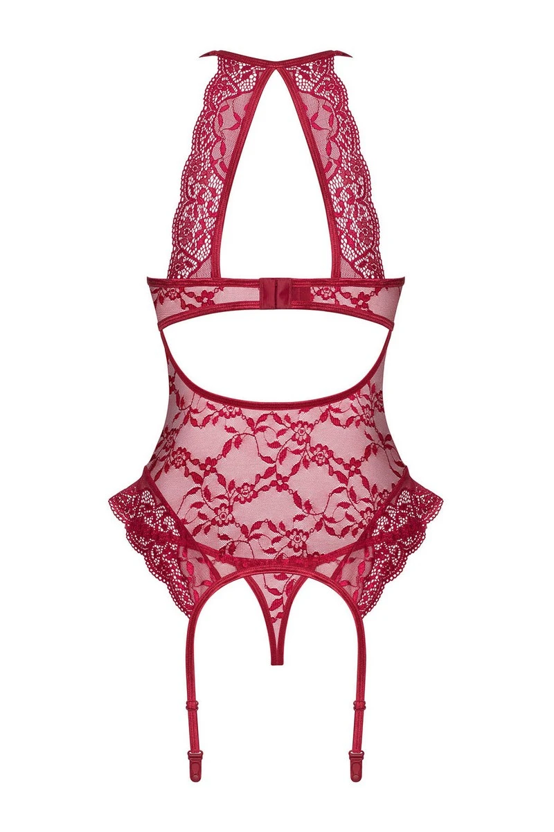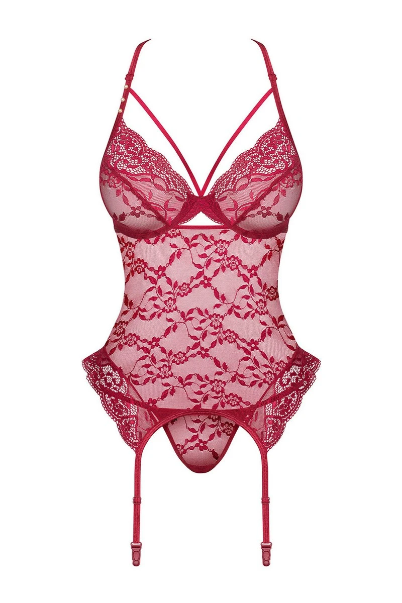 La partie inférieure est opaque, les côtés sont dotés d’un voile extensible qui s’assurera que la lingerie est moulante. Les bretelles sont réglables pour ajuster la guêpière en hauteur, le string assorti est inclus.