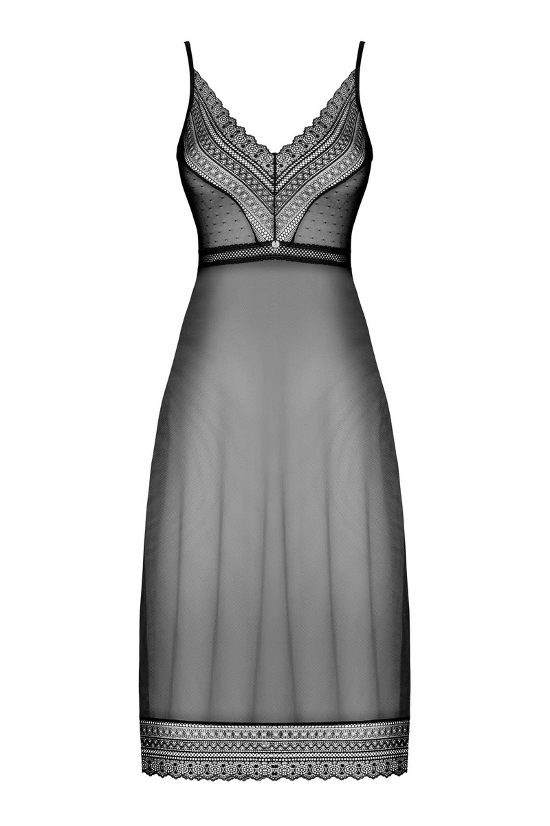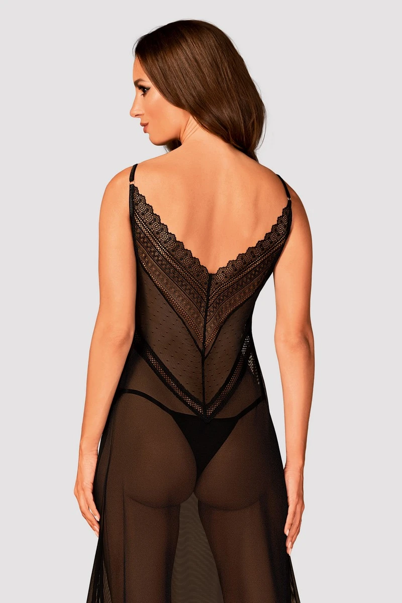 Le coeur de son charme est concentré sur le buste et plus particulièrement sur la poitrine avec des bonnets joliment perforés. L’ouverture du décolleté reste discrète afin de laisser plus de place au spectacle offert par la transparence, concrétisée par une chute de résille jusqu’aux chevilles.